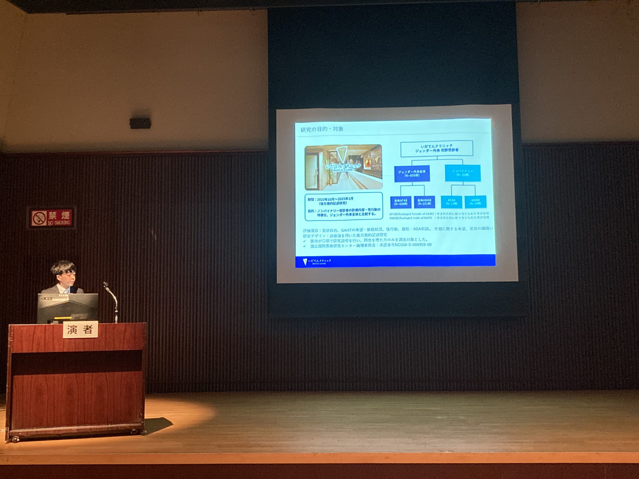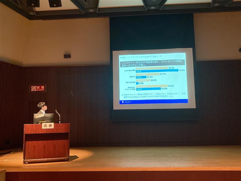 当院の石内医師は、いだてんクリニックにおける診療実績をもとに、多様なジェンダー医療ニーズについて発表を行い、特にノンバイナリー/Xジェンダーに関する国内の現状や課題について報告を行いました。